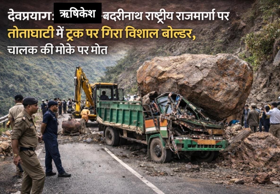 देवप्रयाग: ऋषिकेश–बदरीनाथ राष्ट्रीय राजमार्ग पर तोताघाटी में ट्रक पर गिरा विशाल बोल्डर, चालक की मौके पर मौत