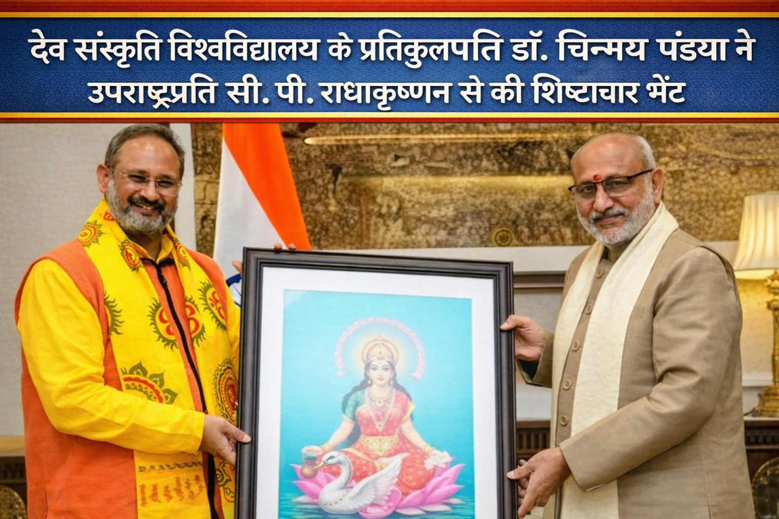 देव संस्कृति विश्वविद्यालय के प्रतिकुलपति डॉ. चिन्मय पंड्या ने नई दिल्ली प्रवास के दौरान भारत के उपराष्ट्रपति सी. पी. राधाकृष्णन से शिष्टाचार भेंट की। इस अवसर पर राष्ट्रनिर्माण में युवाशक्ति की भूमिका, मूल्य आधारित शिक्षा, सांस्कृतिक पुनर्जागरण तथा वैश्विक समन्वय जैसे महत्वपूर्ण विषयों पर सारगर्भित चर्चा हुई। साथ ही युवाओं को भारतीय संस्कृति, नैतिक मूल्यों और सामाजिक उत्तरदायित्व से जोड़ने के विविध आयामों पर विस्तृत विचार-विमर्श किया गया।